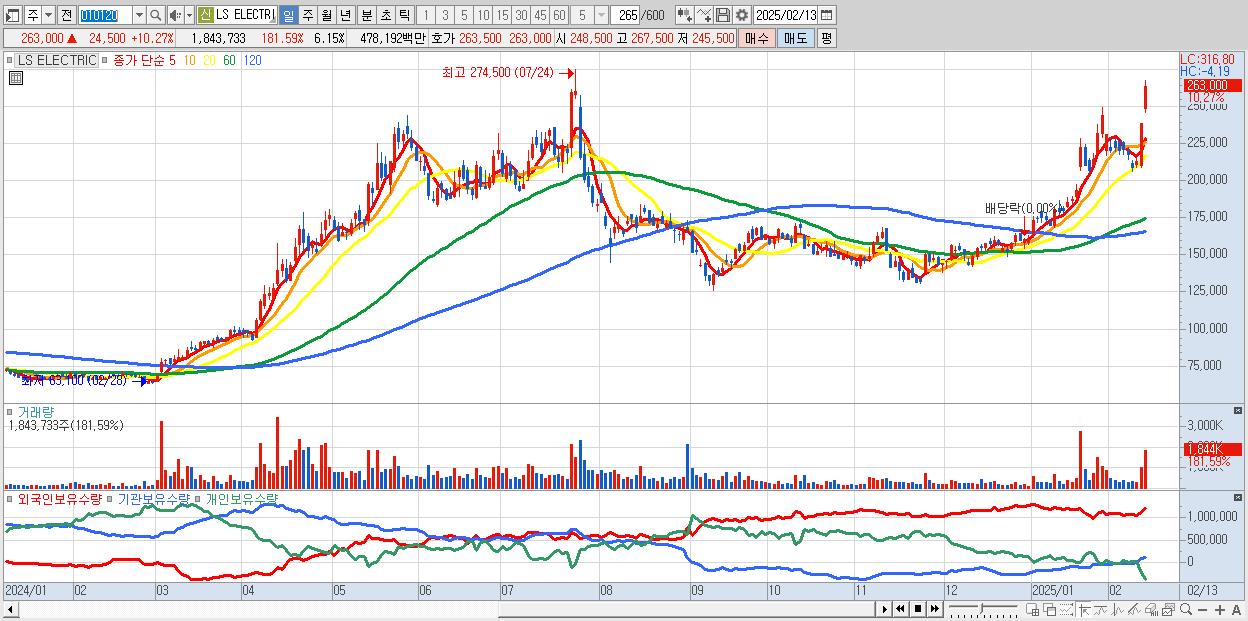 - LS ELECTRIC (263,000원 ▲ 10.27% , 시총: 78,900억, 거래량: 1,843,733, 거래대금:4,782억)