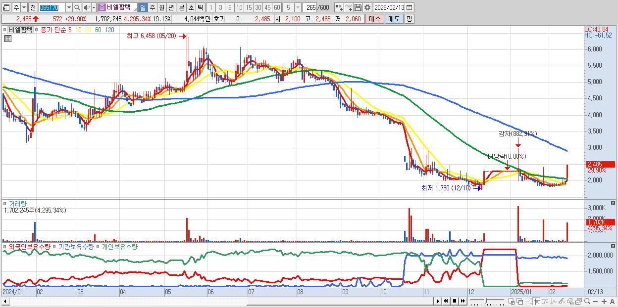 - 비엘팜텍 (2,485원 ▲ 29.9% , 시총: 221억, 거래량: 1,702,245, 거래대금:40억)