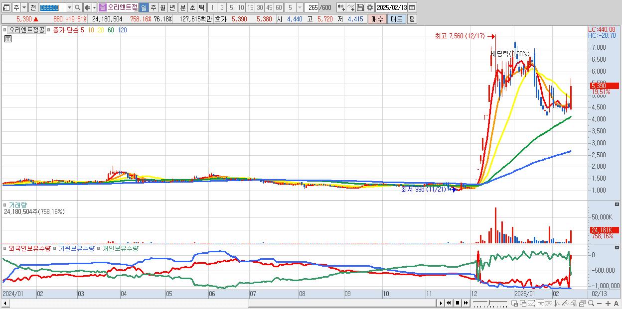 - 오리엔트정공 (5,390원 ▲ 19.51% , 시총: 1,711억, 거래량: 24,180,504, 거래대금:1,276억)