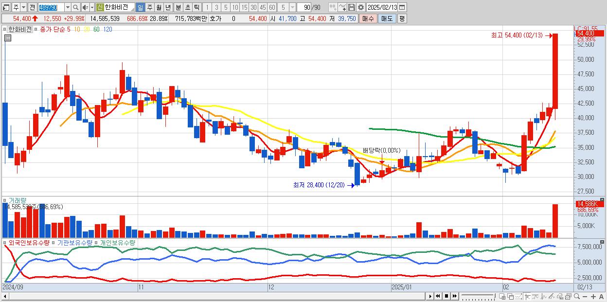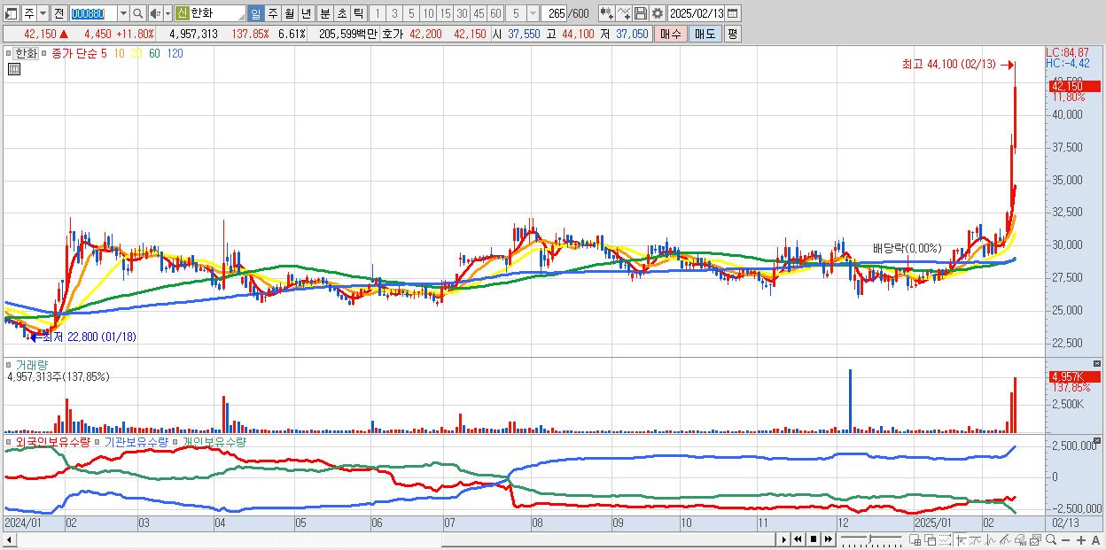 - 한화 (42,150원 ▲ 11.8% , 시총: 31,595억, 거래량: 4,957,313, 거래대금:2,056억)