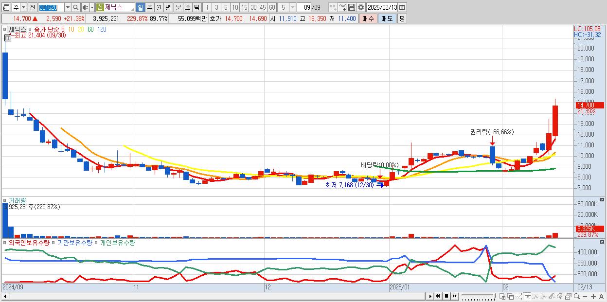 - 제닉스 (14,700원 ▲ 21.39% , 시총: 643억, 거래량: 3,925,231, 거래대금:551억)