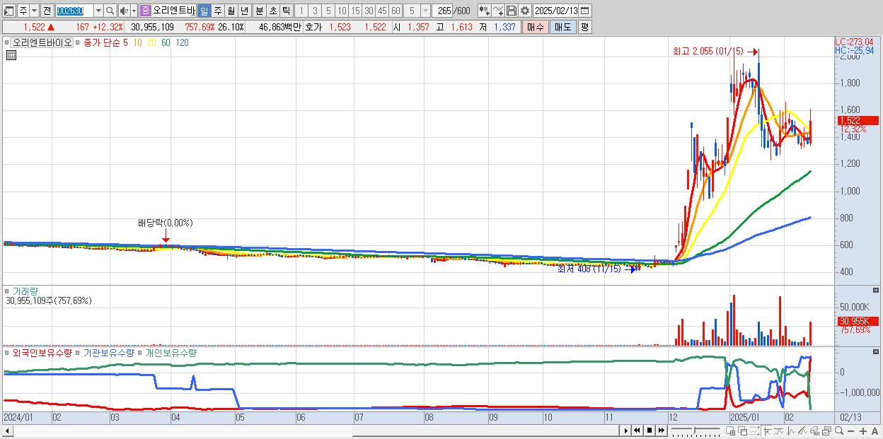 - 오리엔트바이오 (1,522원 ▲ 12.32% , 시총: 1,805억, 거래량: 30,955,109, 거래대금:469억)