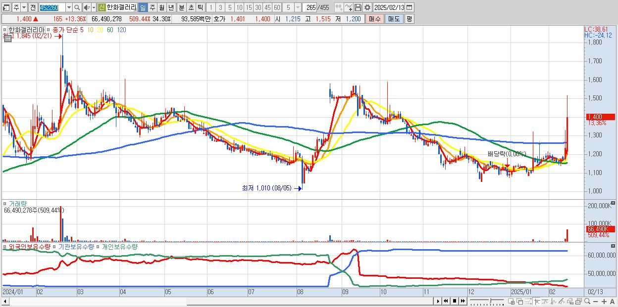 - 한화갤러리아 (1,400원 ▲ 13.36% , 시총: 2,714억, 거래량: 66,490,278, 거래대금:936억)