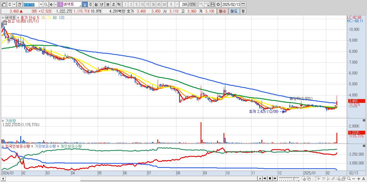 - 버넥트 (3,460원 ▲ 12.52% , 시총: 386억, 거래량: 1,222,272, 거래대금:43억)