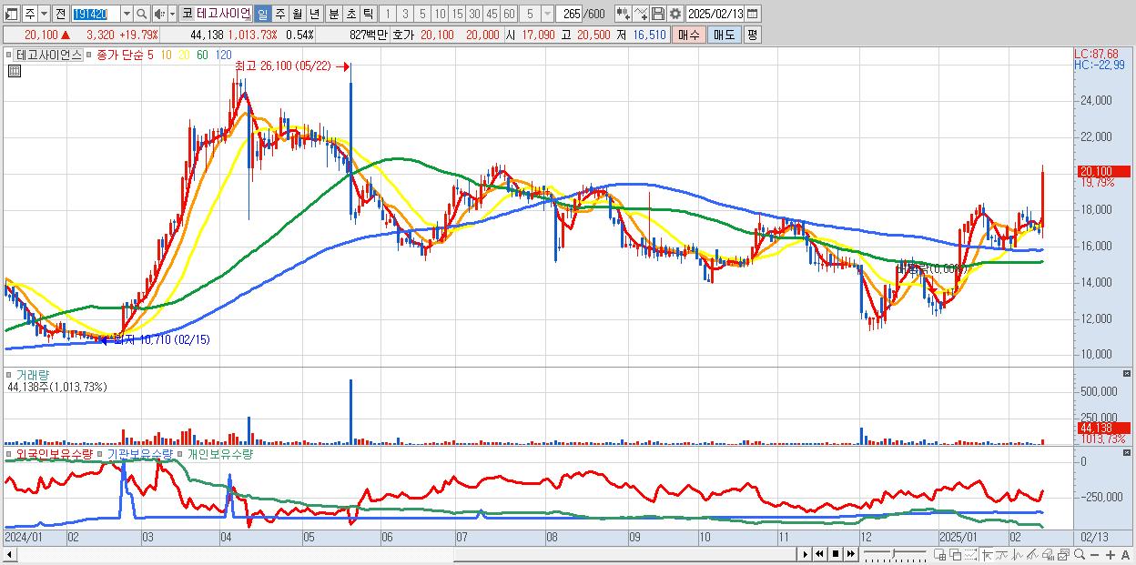 - 테고사이언스 (20,100원 ▲ 19.79% , 시총: 1,630억, 거래량: 44,138, 거래대금:8억)