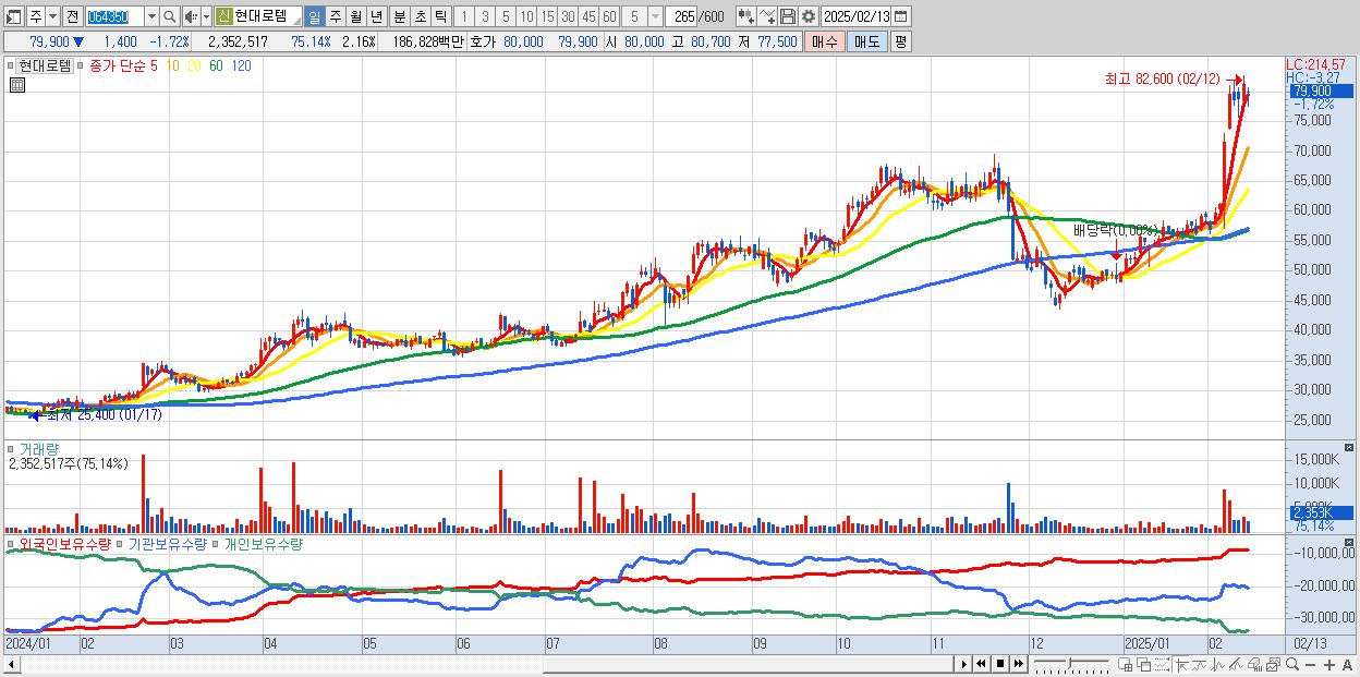 - 현대로템 (79,900원 ▼ -1.72% , 시총: 87,205억, 외국인 순매수 거래금:90억)