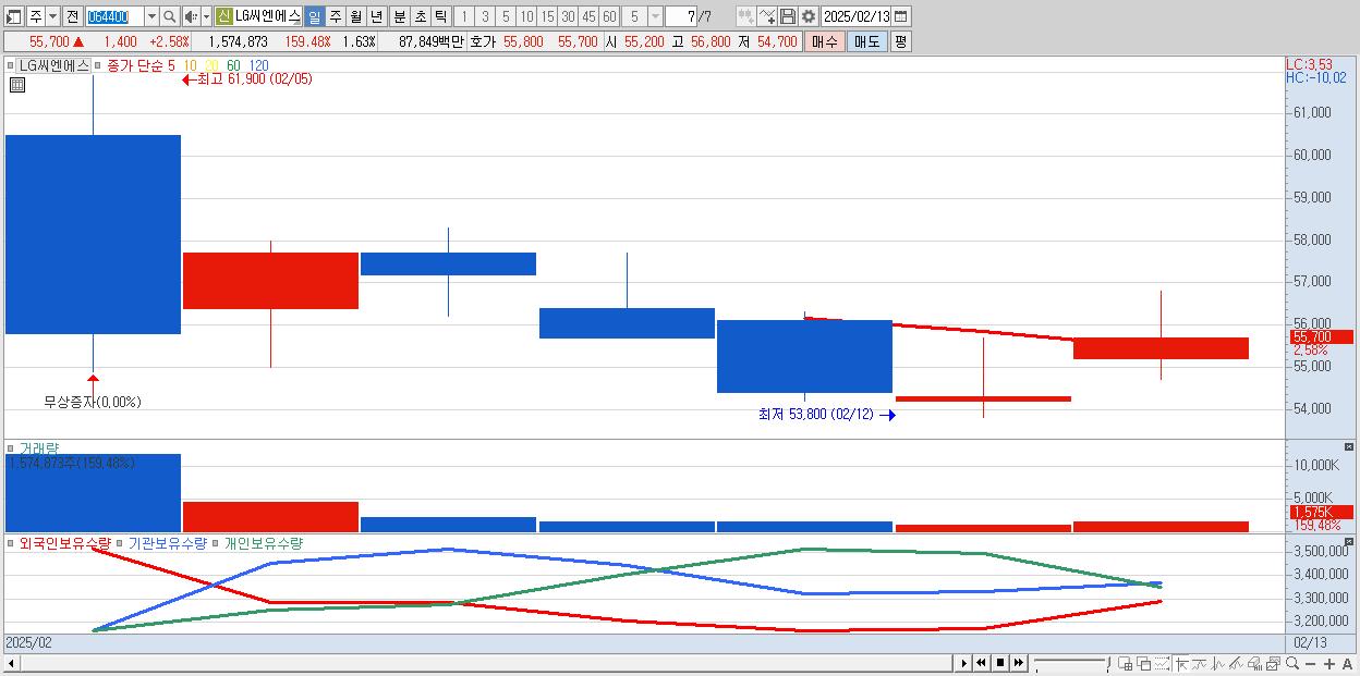 - LG씨엔에스 (55,700원 ▲ 2.58% , 시총: 53,965억, 외국인 순매수 거래금:68억)