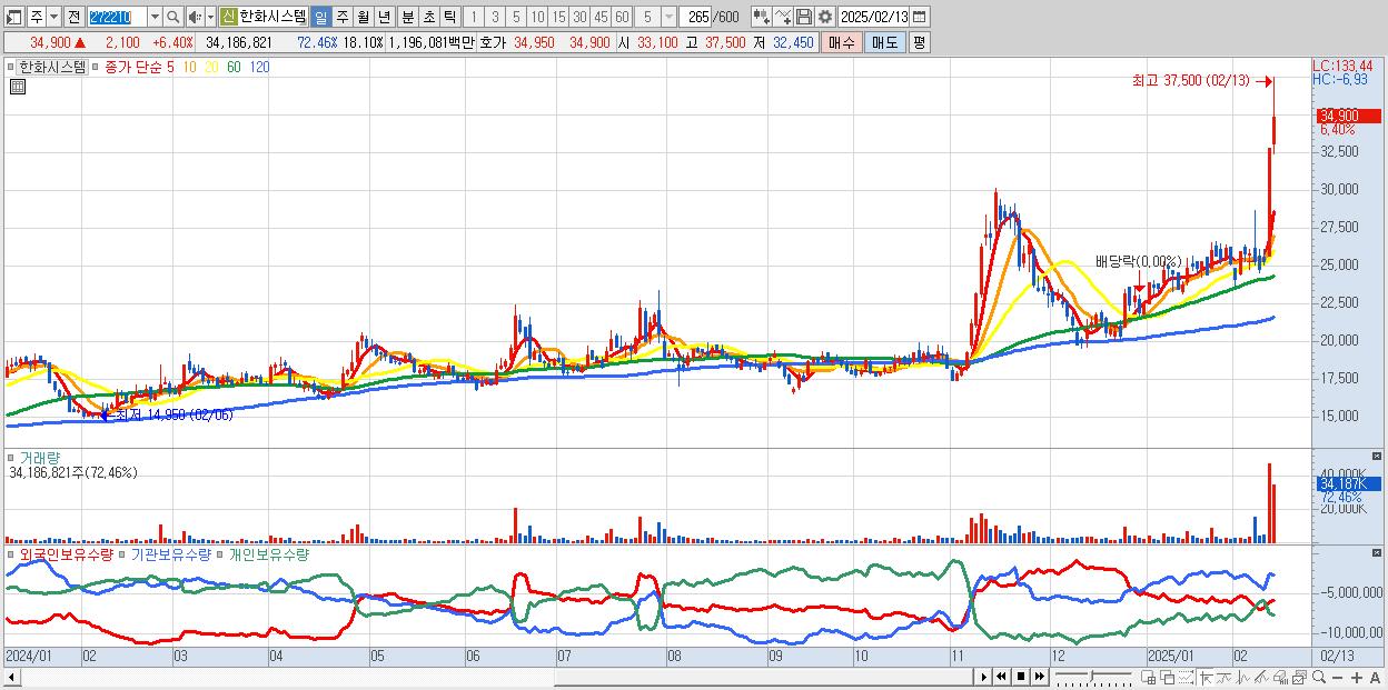 - 한화시스템 (34,900원 ▲ 6.4% , 시총: 65,933억, 외국인 순매수 거래금:91억)