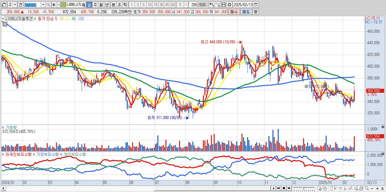 - LG에너지솔루션 (358,000원 ▲ 5.76% , 시총: 837,720억, 외국인 순매수 거래금:386억)