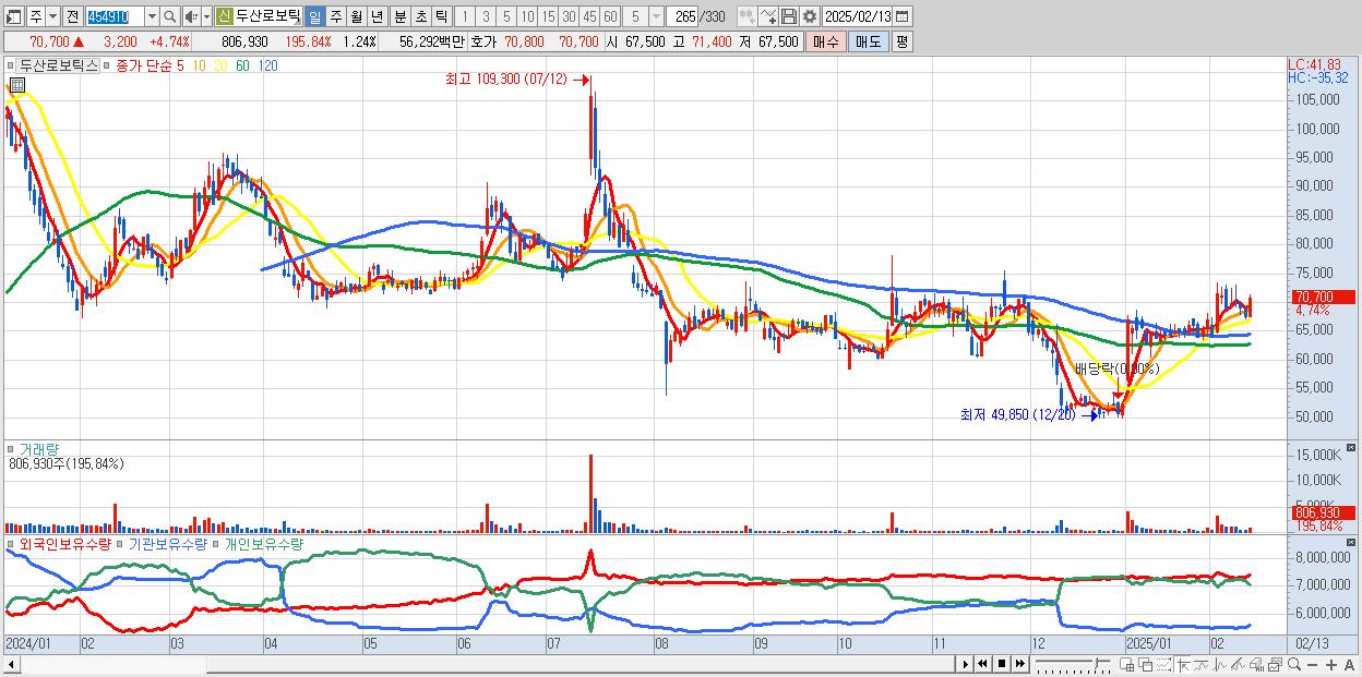 - 두산로보틱스 (70,700원 ▲ 4.74% , 시총: 45,828억, 외국인 순매수 거래금:64억)