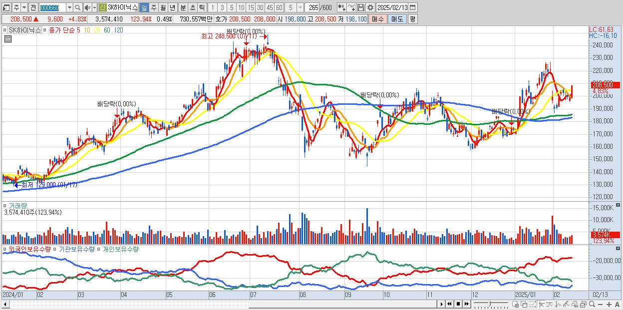 - SK하이닉스 (208,500원 ▲ 4.83% , 시총: 1,517,885억, 외국인 순매수 거래금:403억)