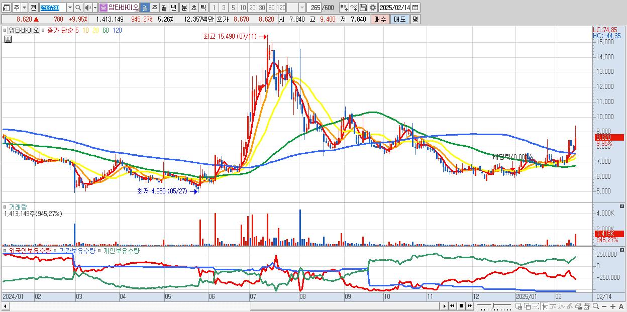 - 압타바이오 (8,620원 ▲ 9.95% , 시총: 2,317억, 거래량: 1,413,149, 거래대금:124억)