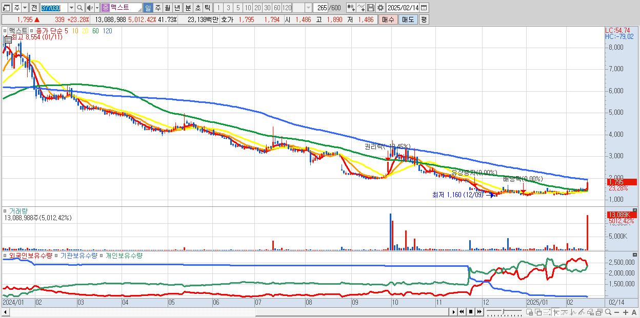 - 맥스트 (1,795원 ▲ 23.28% , 시총: 563억, 거래량: 13,088,988, 거래대금:231억)