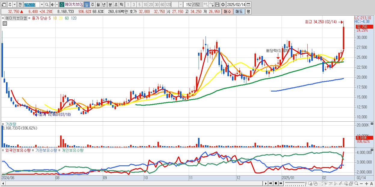 - 에이치브이엠 (32,750원 ▲ 24.29% , 시총: 3,898억, 거래량: 8,168,733, 거래대금:2,606억)