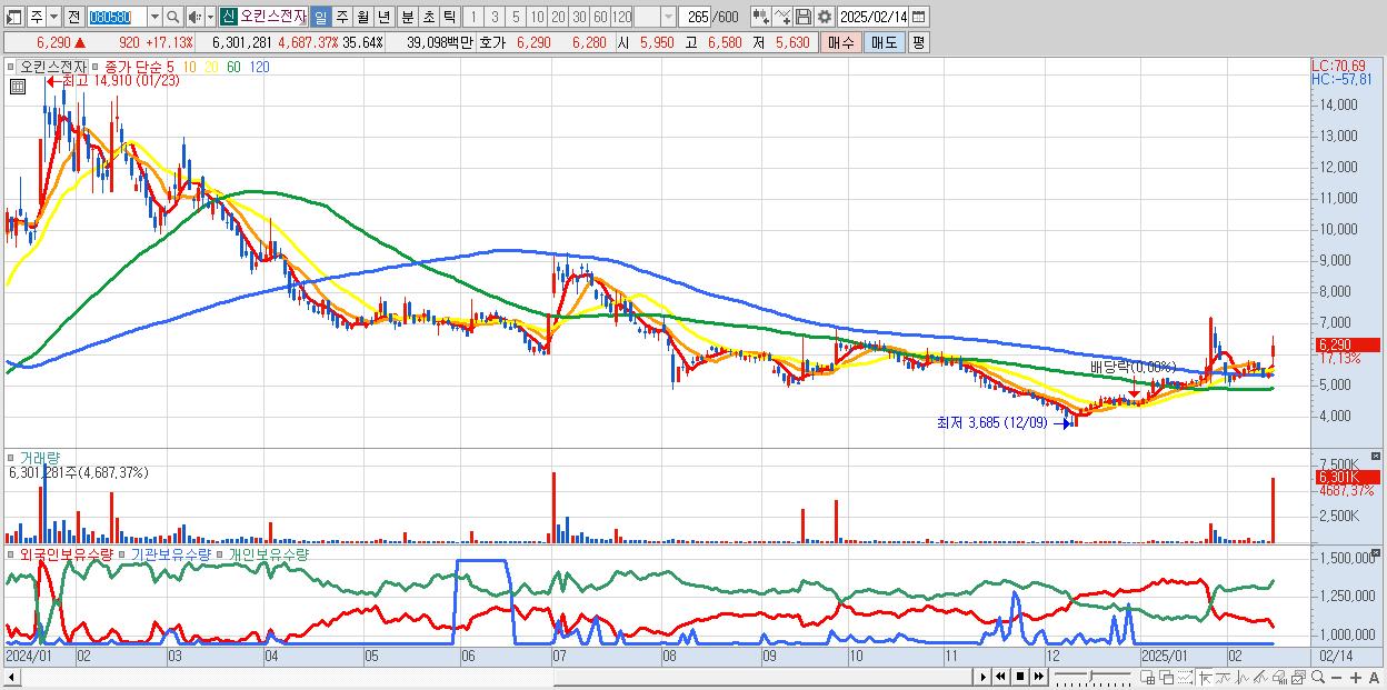 - 오킨스전자 (6,290원 ▲ 17.13% , 시총: 1,112억, 거래량: 6,301,281, 거래대금:391억)