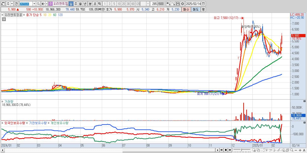 - 오리엔트정공 (5,980원 ▲ 10.95% , 시총: 1,898억, 거래량: 18,966,300, 거래대금:1,091억)