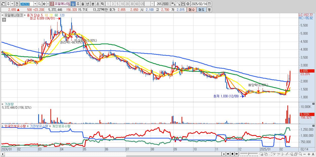 - 유일에너테크 (2,655원 ▲ 23.2% , 시총: 908억, 거래량: 5,372,446, 거래대금:132억)