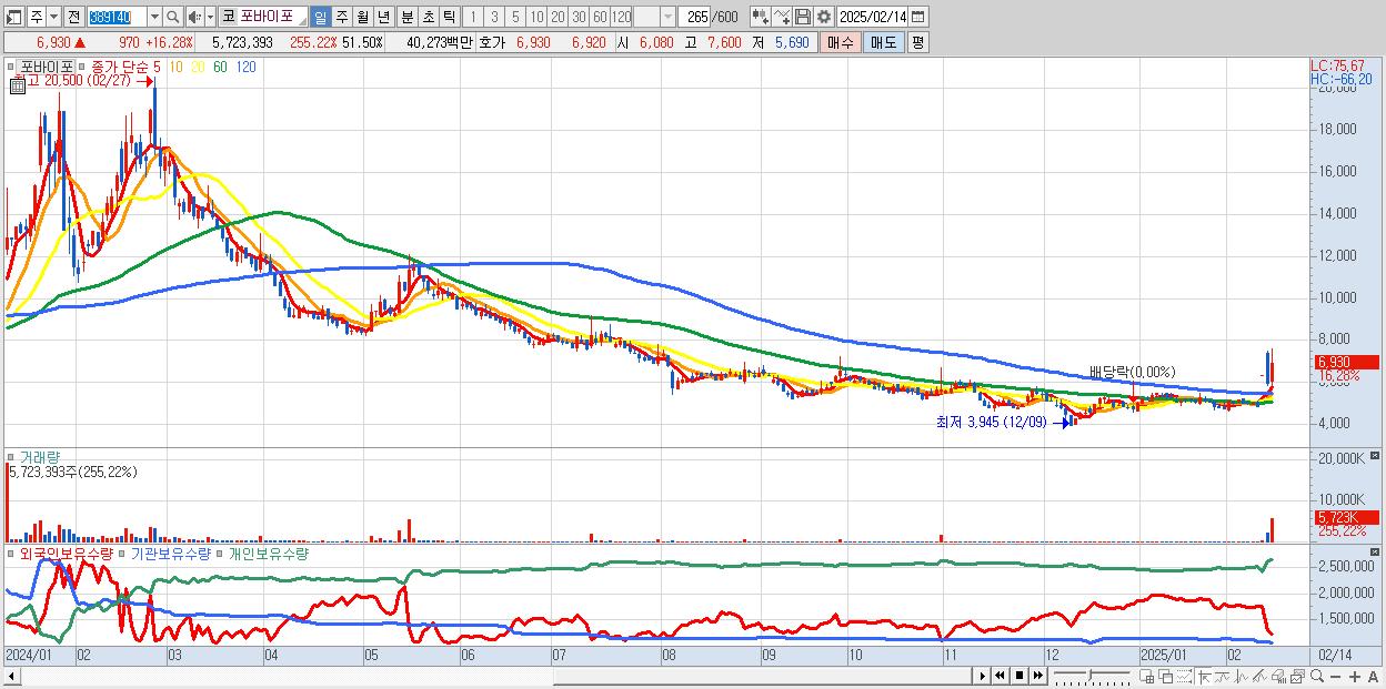 - 포바이포 (6,930원 ▲ 16.28% , 시총: 770억, 거래량: 5,723,393, 거래대금:403억)