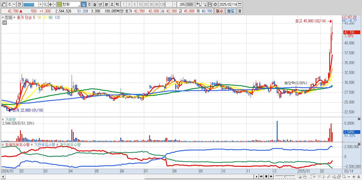 - 한화 (42,700원 ▲ 1.3% , 시총: 32,007억, 외국인 순매수 거래금:124억)