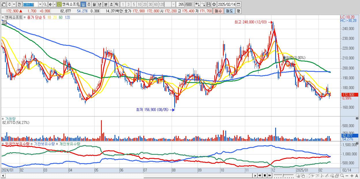 - 엔씨소프트 (172,900원 ▲ 0.99% , 시총: 37,959억, 외국인 순매수 거래금:44억)