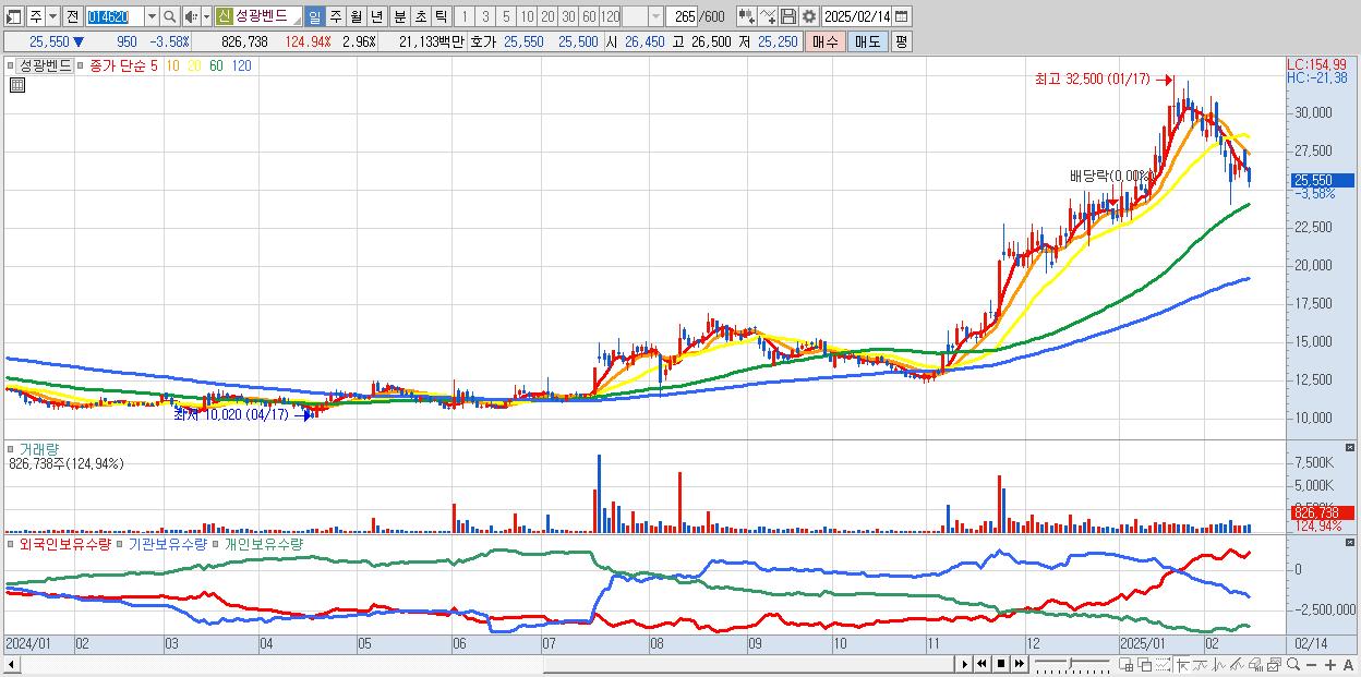 - 성광벤드 (25,550원 ▼ -3.58% , 시총: 7,136억, 외국인 순매수 거래금:52억)