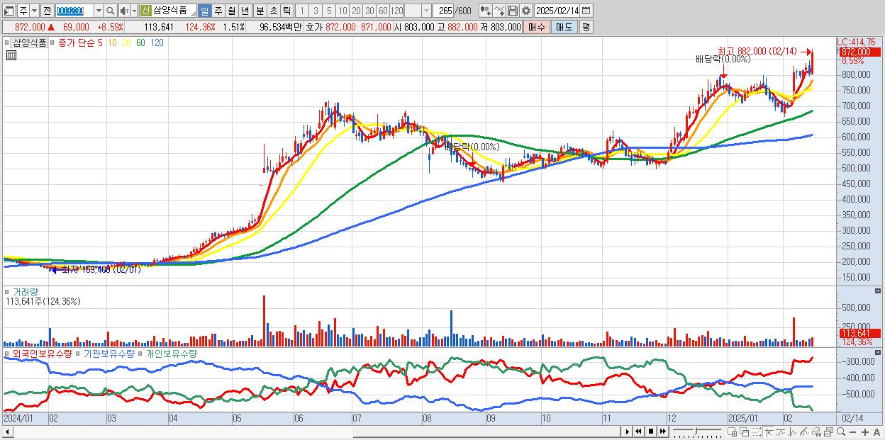 - 삼양식품 (872,000원 ▲ 8.59% , 시총: 65,688억, 외국인 순매수 거래금:218억)