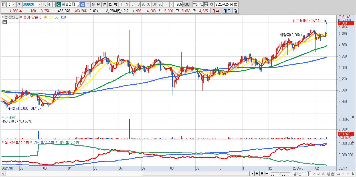 - 화승인더 (4,980원 ▲ 3.75% , 시총: 2,755억, 거래량: 453,978, 거래대금:23억, KOSPI)