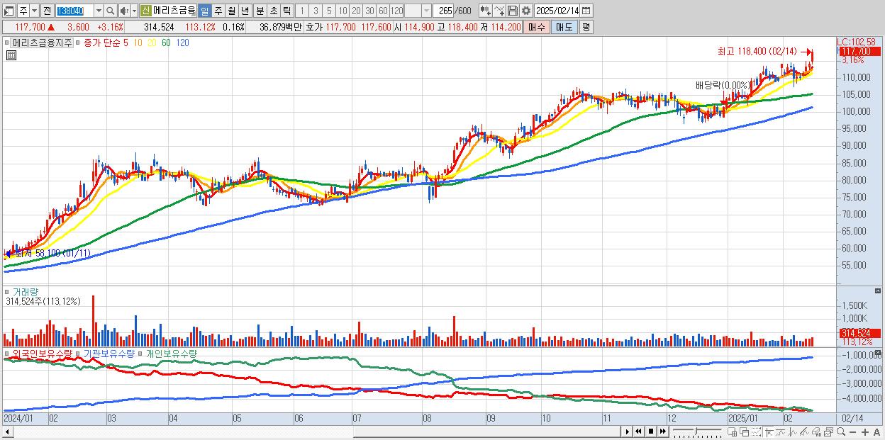 - 메리츠금융지주 (117,700원 ▲ 3.16% , 시총: 224,478억, 거래량: 314,524, 거래대금:369억, KOSPI)