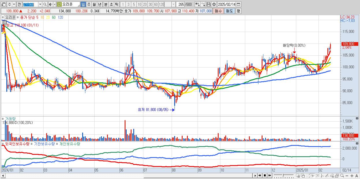- 오리온 (109,800원 ▲ 2.04% , 시총: 43,411억, 거래량: 134,880, 거래대금:148억, KOSPI)