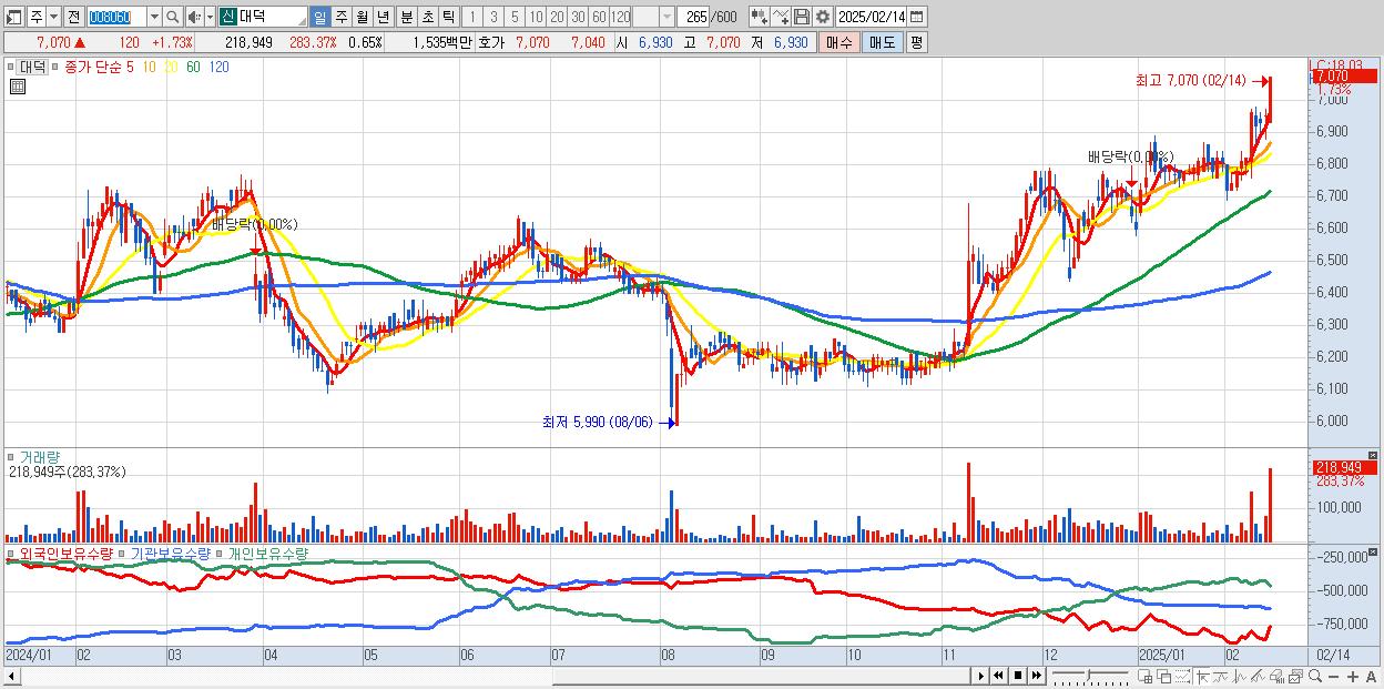 - 대덕 (7,070원 ▲ 1.73% , 시총: 2,396억, 거래량: 218,949, 거래대금:15억, KOSPI)