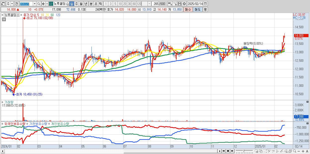 노루홀딩스 14,000원 ▲ 0.07% (KOSPI, 000320)