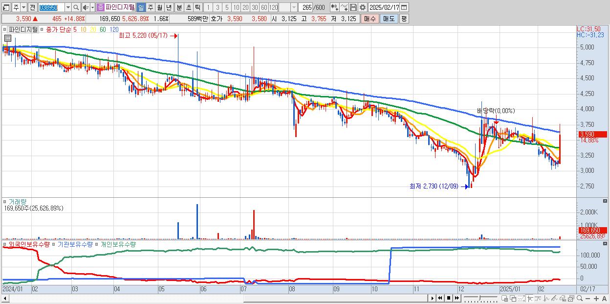- 파인디지털 (3,590원 ▲ 14.88% , 시총: 367억, 거래량: 169,650, 거래대금:6억)
