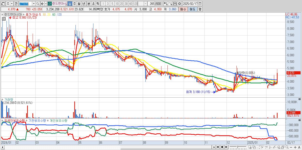 - 린드먼아시아 (4,670원 ▲ 20.05% , 시총: 639억, 거래량: 3,234,208, 거래대금:148억)