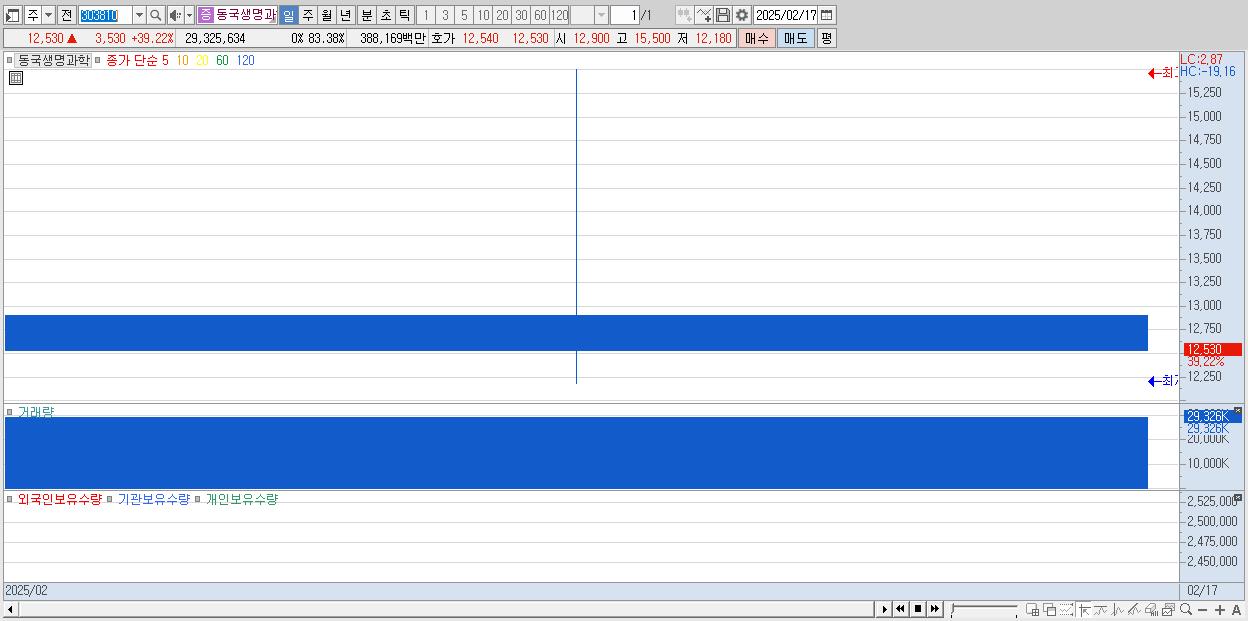 - 동국생명과학 (12,530원 ▲ 39.22% , 시총: 2,004억, 거래량: 29,325,634, 거래대금:3,882억)