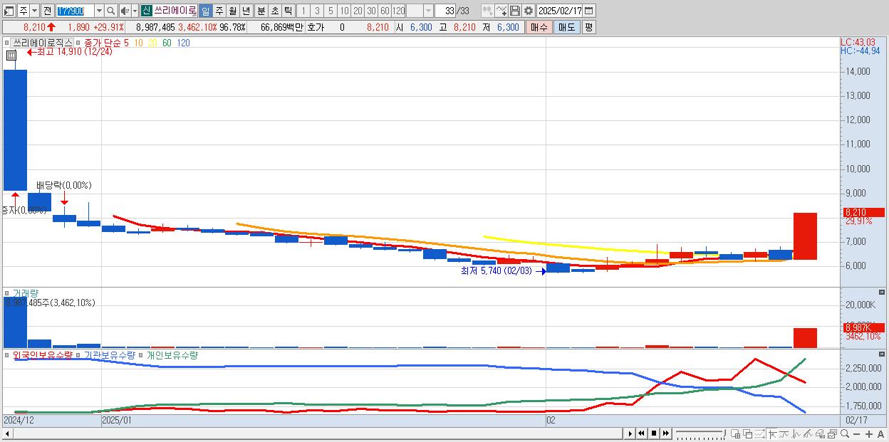 - 쓰리에이로직스 (8,210원 ▲ 29.91% , 시총: 762억, 거래량: 8,987,485, 거래대금:669억)