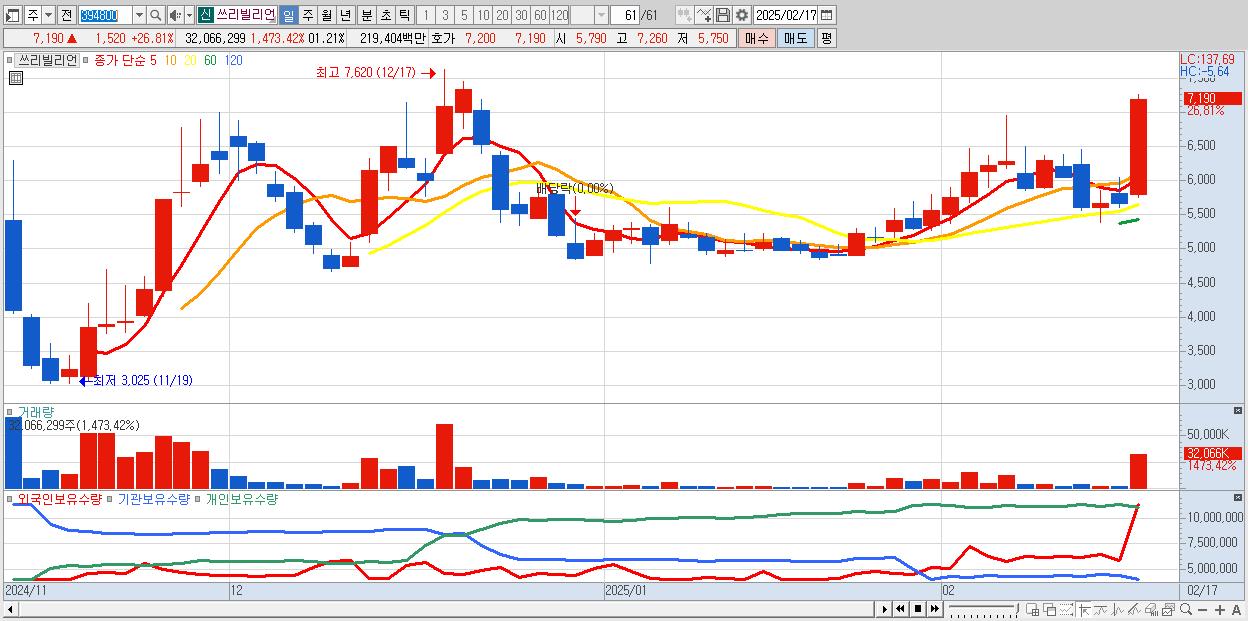 - 쓰리빌리언 (7,190원 ▲ 26.81% , 시총: 2,278억, 거래량: 32,066,299, 거래대금:2,194억)