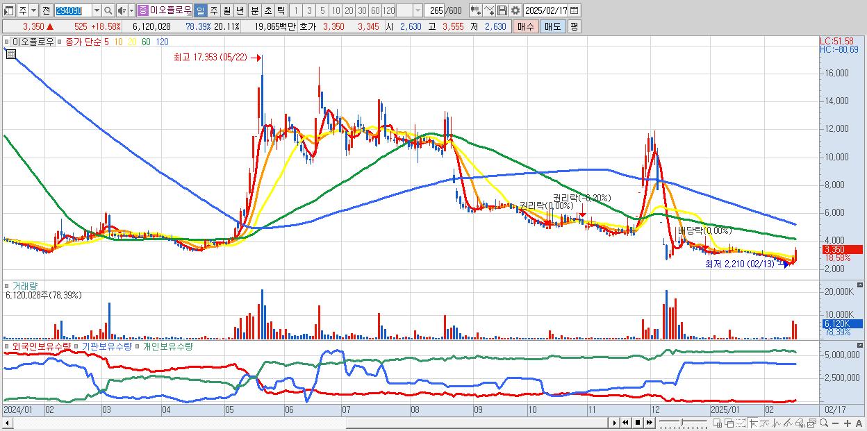 - 이오플로우 (3,350원 ▲ 18.58% , 시총: 1,020억, 거래량: 6,120,028, 거래대금:199억)