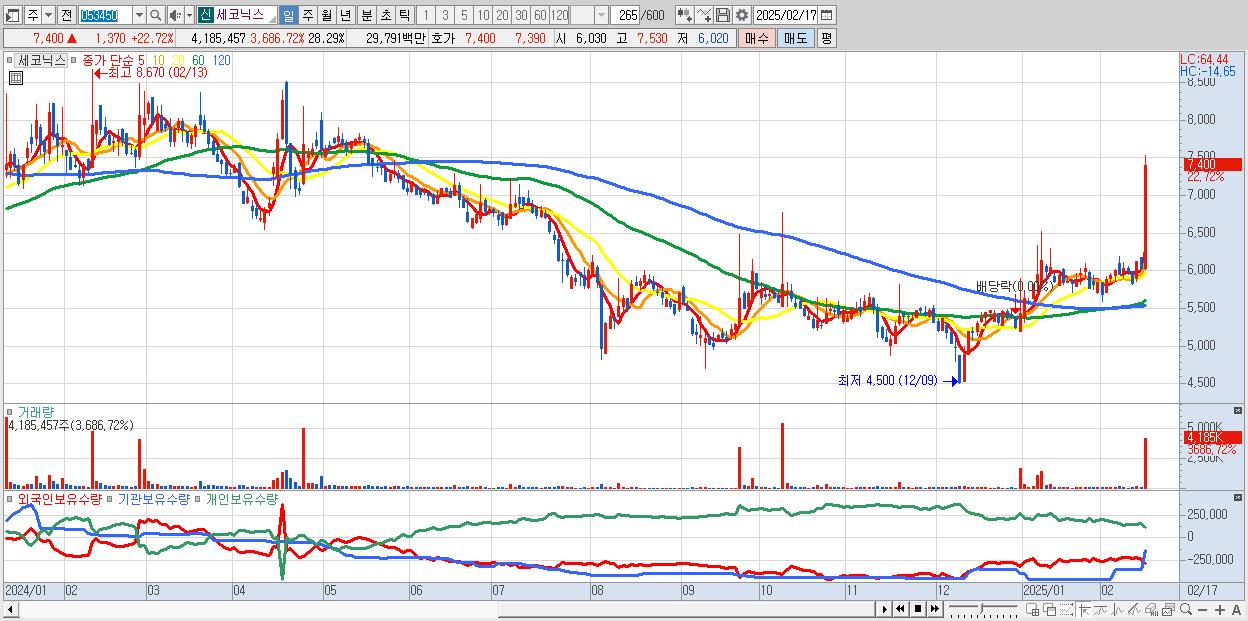 - 세코닉스 (7,400원 ▲ 22.72% , 시총: 1,095억, 거래량: 4,185,457, 거래대금:298억)