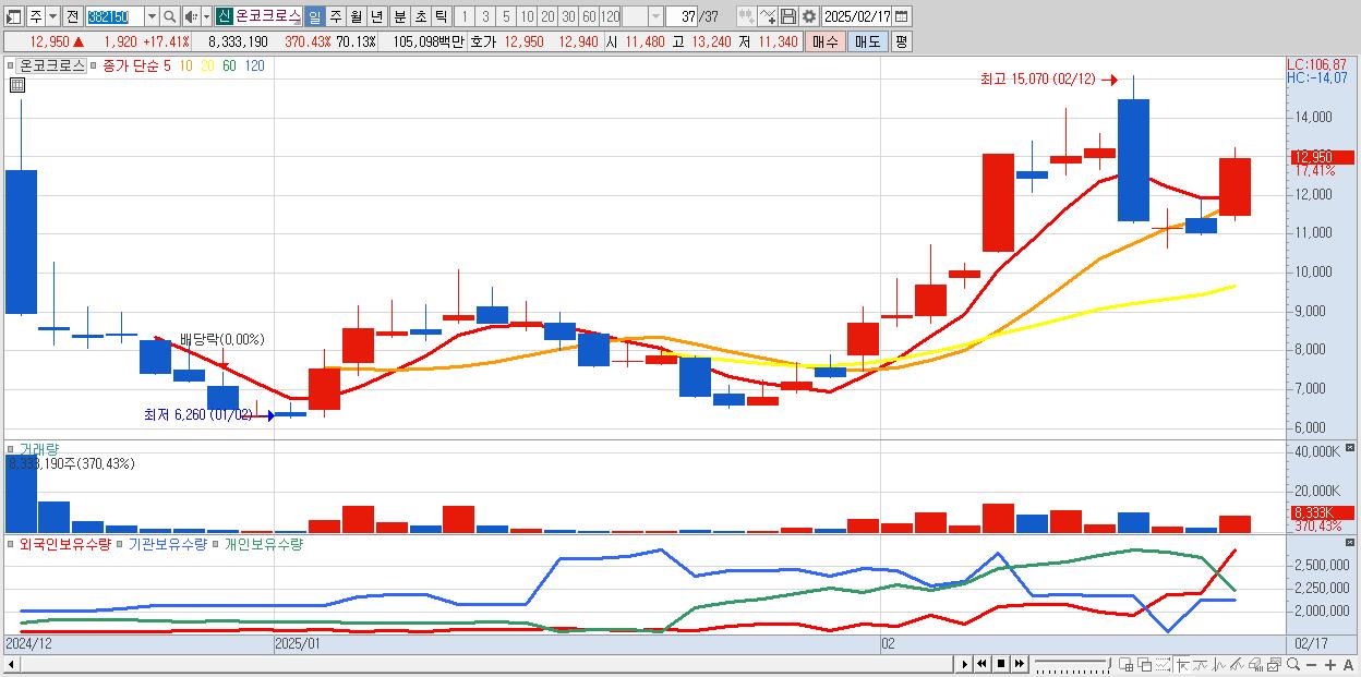 - 온코크로스 (12,950원 ▲ 17.41% , 시총: 1,539억, 거래량: 8,333,190, 거래대금:1,051억)