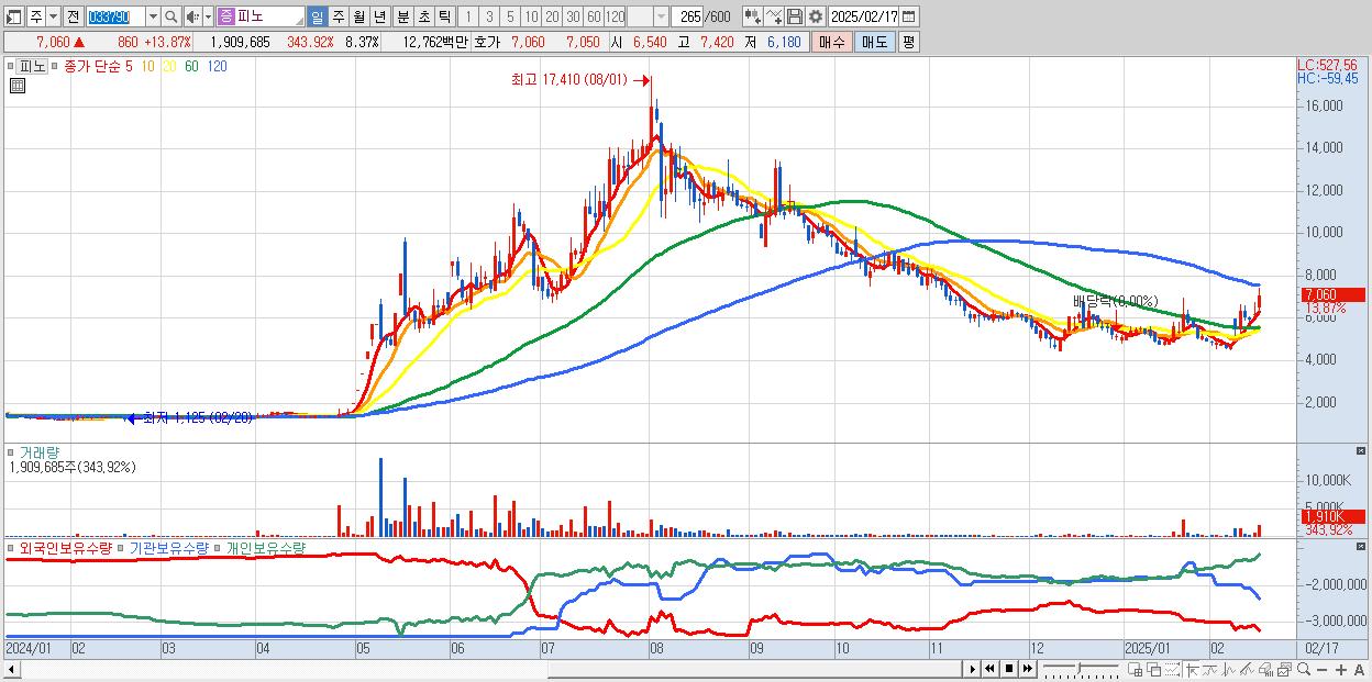 - 피노 (7,060원 ▲ 13.87% , 시총: 1,611억, 거래량: 1,909,685, 거래대금:128억)
