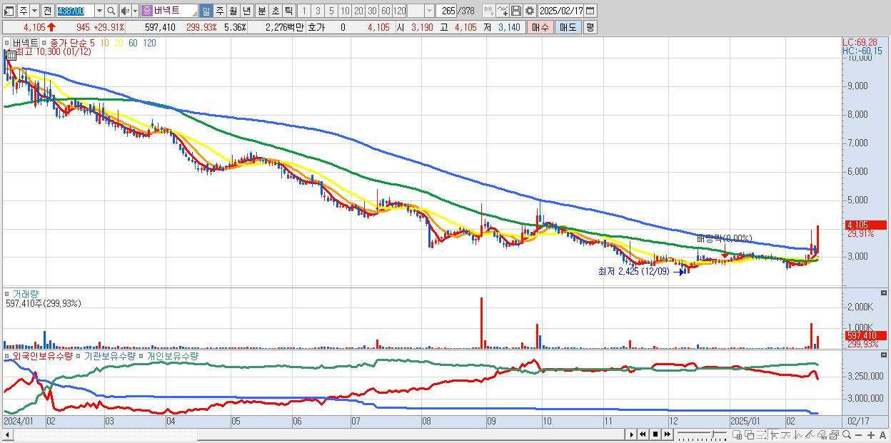 - 버넥트 (4,105원 ▲ 29.91% , 시총: 457억, 거래량: 597,410, 거래대금:23억)