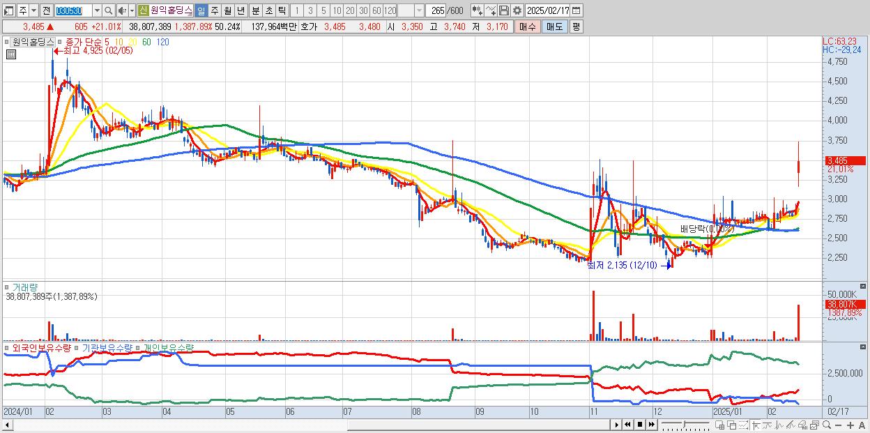 - 원익홀딩스 (3,485원 ▲ 21.01% , 시총: 2,692억, 거래량: 38,807,389, 거래대금:1,380억)