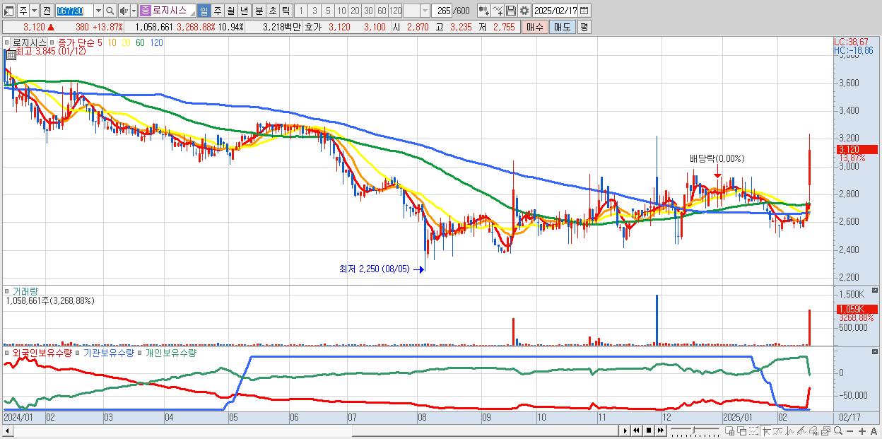 - 로지시스 (3,120원 ▲ 13.87% , 시총: 302억, 거래량: 1,058,661, 거래대금:32억)