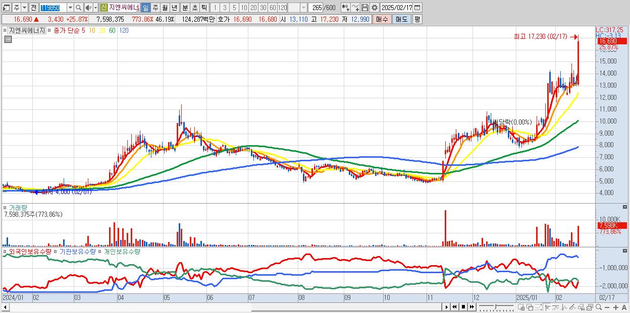 - 지엔씨에너지 (16,690원 ▲ 25.87% , 시총: 2,745억, 거래량: 7,598,375, 거래대금:1,243억)