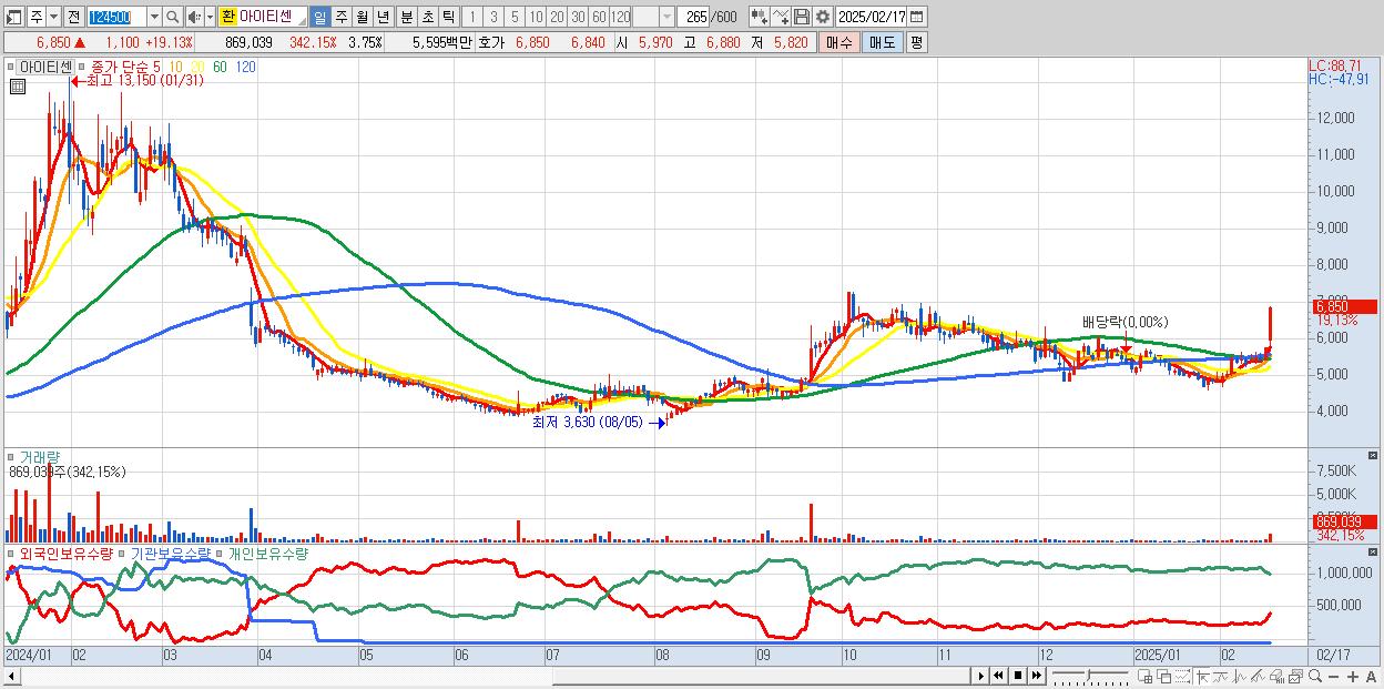 - 아이티센 (6,850원 ▲ 19.13% , 시총: 1,590억, 거래량: 869,039, 거래대금:56억)