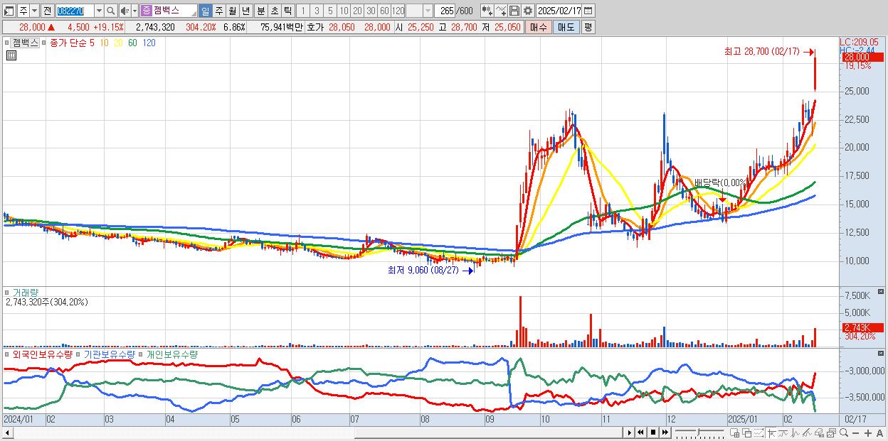 - 젬백스 (28,000원 ▲ 19.15% , 시총: 11,198억, 거래량: 2,743,320, 거래대금:759억)