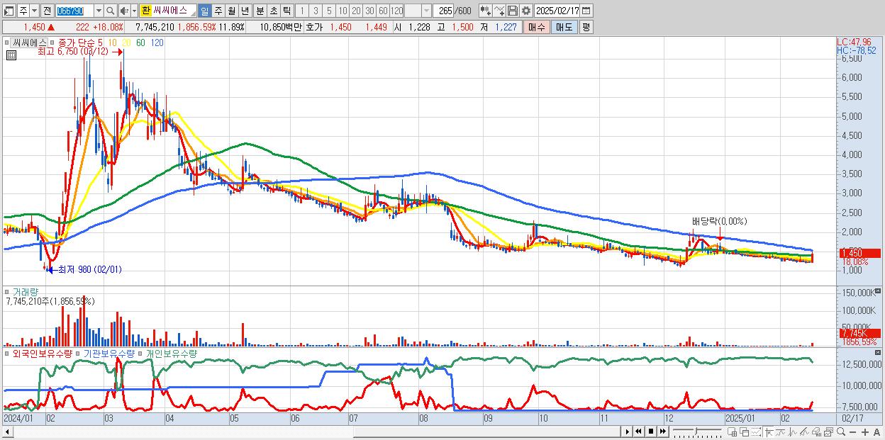 - 씨씨에스 (1,450원 ▲ 18.08% , 시총: 945억, 거래량: 7,745,210, 거래대금:109억)