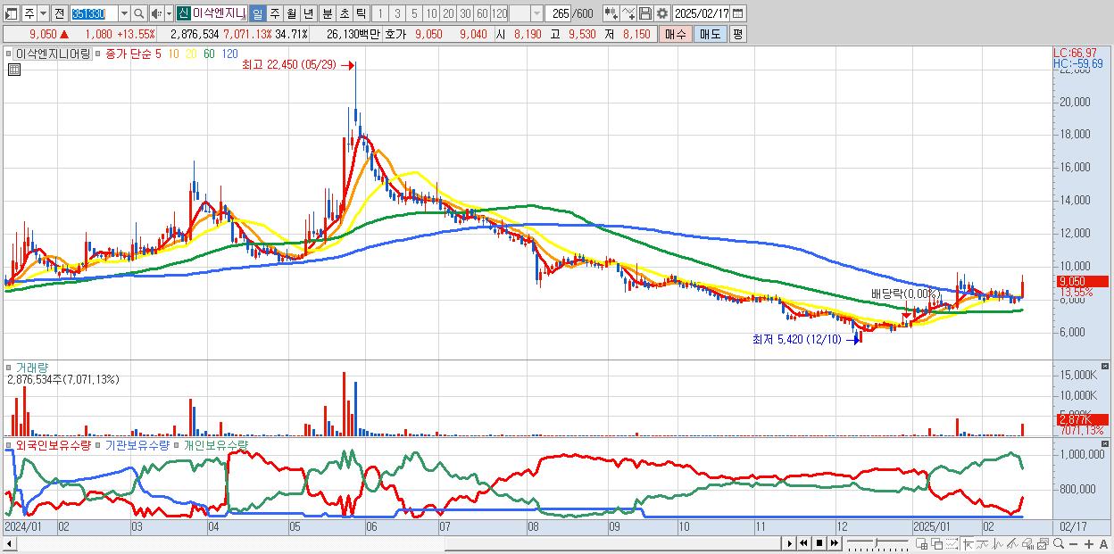 - 이삭엔지니어링 (9,050원 ▲ 13.55% , 시총: 750억, 거래량: 2,876,534, 거래대금:261억)