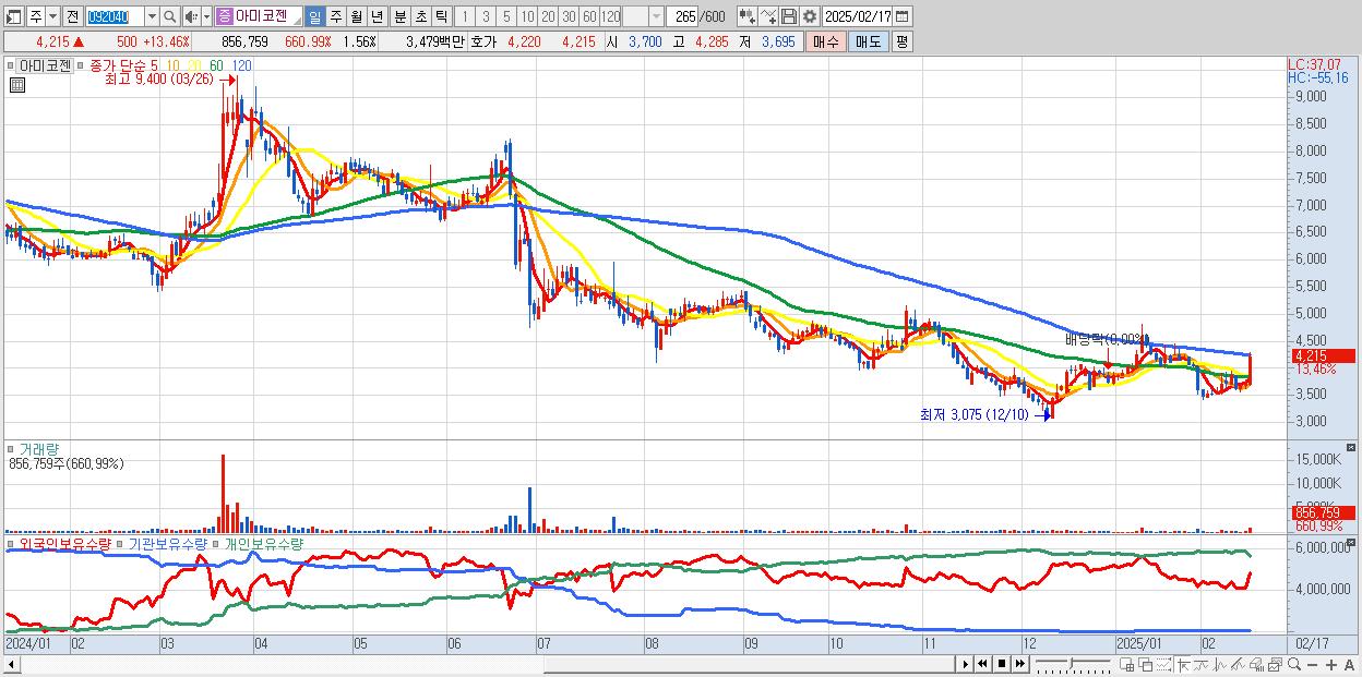 - 아미코젠 (4,215원 ▲ 13.46% , 시총: 2,319억, 거래량: 856,759, 거래대금:35억)