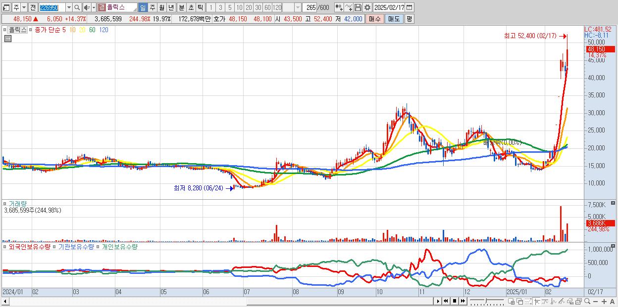 - 올릭스 (48,150원 ▲ 14.37% , 시총: 8,888억, 거래량: 3,685,599, 거래대금:1,727억)